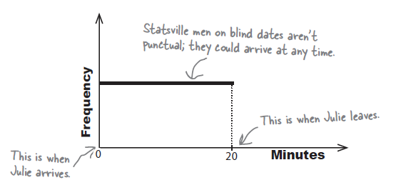 20분 동안만 기다리고 그 직후 떠나버리는 줄리의 상황에서 20분 동안의 시간 중에서 5분이상을 기달릴 확률을 구하는 것은 이산데이터와는 다른 성격을 갖는다. 아래는 베팅에서의 상금을 기초로 각 상황에 (discrete situation) 맞는 확률을 구하여 전체를 파악하는 것이지만, 시간의 경우는 이와 같은 방법을 수행할 수 없다.