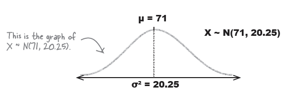 $X \sim N(71, 20.25)$