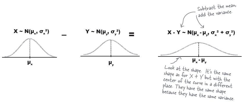 | $X - Y$ $\text{when}$ $X \sim N(\mu^{\;}_{X}, \sigma^{2}_{X})$ $Y\sim N(\mu^{ }_{Y}, \sigma^{2}_{Y})$ | $X - Y \sim N(\mu_{X} - \mu_{Y}, \sigma^{2}_{X} + \sigma^{2}_{Y}) $ | X, Y events are independent |