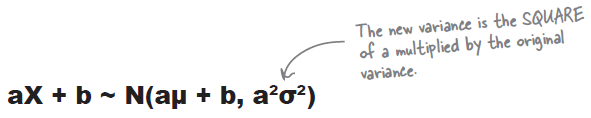 | $aX + b$ $\text{when}$ $X \sim N(\mu_{X}, \sigma^{2}_{X})$ | $aX + b \sim N \left(a\mu_{X} + b, a^{2}\sigma^{2}_{X}\right)$ | a, b are constant. |