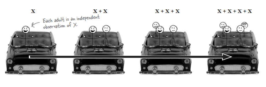 | $X_{1} + X_{2} + . . . X_{n}$ $X \sim N(\mu, \sigma^{2})$ | $X_{1} + X_{2} + . . . X_{n} \sim N(n\mu, n\sigma^2)$ | $X_{1} + X_{2} + . . . X_{n}$ are independent observation of X |