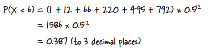 Let’s start off by working this out using the binomial distribution. Use the binomial distribution to find P(X < 6) where X ~ B(12, 0.5).