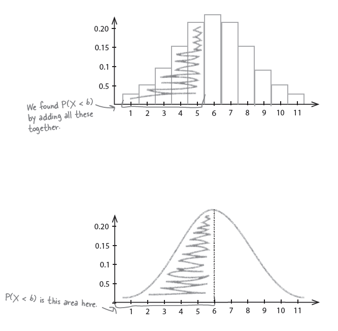 이에 대한 probability는 $P(X < 6) = 0.5$ 이다. 이 값은 앞에서 구한 binomial distribution 계산과 다른 값을 갖는다. 즉, $0.387 \ne 0.5$ 이다. 그 이유는 . . . .