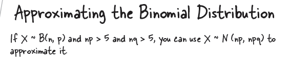 | $\text{Normal approximation of X} $ $X \sim B \left(n, p \right)$ | $X \sim N \left(np, npq\right)$ | $\text{when }\quad np > 5, \; nq > 5$ continuity correction required |