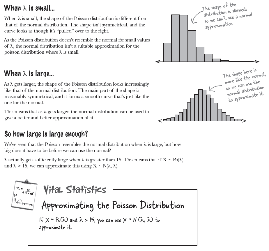 | $\text{Normal approximation of X} $ $X \sim Po \left(\lambda\right)$ | $X \sim N (\lambda, \lambda)$ | $\text{when }\quad \lambda > 15$ continuity correction required $\qquad\qquad\;\;\;$ |