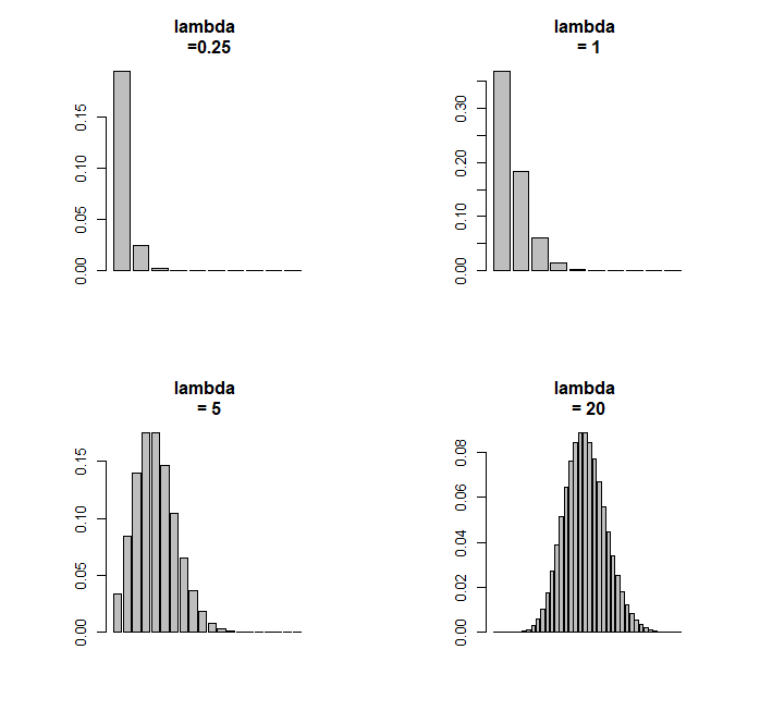 par(mfcol=c(2,2)) barplot(dpois(c(1:10),.25), main = "lambda \n =0.25") barplot(dpois(c(1:20),5), main = "lambda \n = 5") barplot(dpois(c(1:10),1), main = "lambda \n = 1") barplot(dpois(c(1:40),20), main = "lambda \n = 20") par(mfcol=c(1,1))