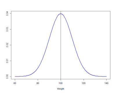 Mean <- 100 Sd <- 10 # X grid for non-standard normal distribution x <- seq(-4, 4, length = 100) * Sd + Mean # Density function f <- dnorm(x, Mean, Sd) plot(x, f, type = "l", lwd = 2, col = "blue", ylab = "", xlab = "Weight") abline(v = Mean) # Vertical line on the mean