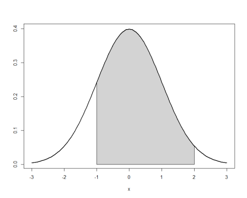 normal_area(mean = 0, sd = 1, lb = -1, ub = 2, lwd = 2)