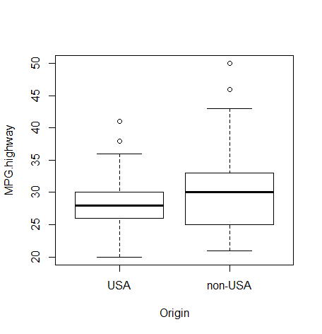 - $\text{MPG.highway: } \bar{X}_{\text{USA}} = \bar{X}_{\text{nonUSA}}$