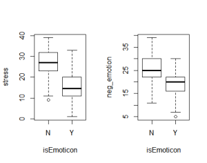 실험 결과 이모티콘의 사용여부에 따라 스트레스에 차이를 보였다. 이모티콘을 사용한 집단의 평균은 스트레스의 정도가 15.26점, 사용하지 않은 집단은 평균 스트레스의 점수가 26.87점으로 확연한 차이가 나왔다.(p<0.001) 따라서 가설1-1은 통계적으로 유의한 확률 내에서 유의미하므로 연구가설은 채택되었다. 다음으로 이모티콘의 사용여부에 따른 부정적 정서의 차이 또한 유의미한 차이를 보였다. 이모티콘을 사용한 집단의 부적 정서의 평균은 19.01점, 이모티콘을 사용하지 않은 집단은 평균이 25.46점이 나왔다.(p<0.001) 따라서 가설1-2도 채택되었으므로 가설1-1과 가설1-2는 유의확률 내에서 유의미한 차이를 보여서 모두 검증되었다.