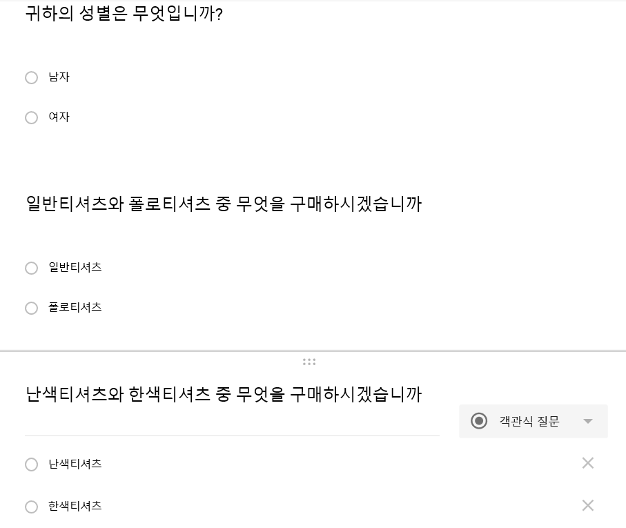 의류 판매점에서 20대 남자들이 티셔츠를 구매하면, 구매한 티셔츠의 종류를 설문조사합니다.