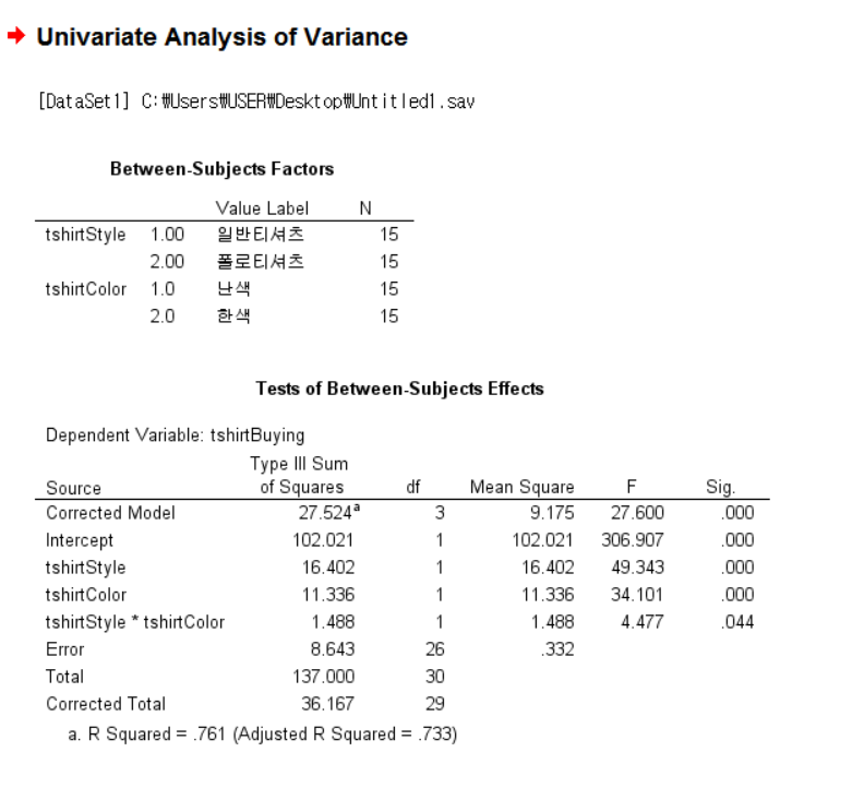 TshirtStyle * TshirtColor의 F값이 4.477, Sig.값이 .000 이기 때문에 .044의 오류 확률을 가지고 난색 폴로티셔츠를 많이 구매함을 입증하였습니다.