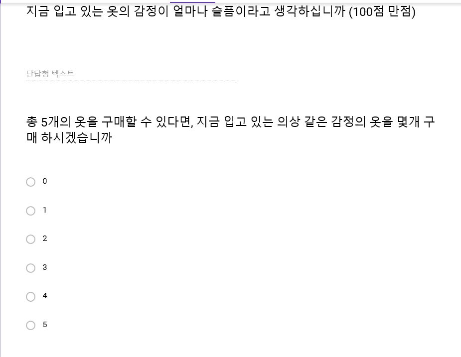 독립 변인들 ‘의상의 감정이 따뜻함, 분노 기쁨 슬픔의 느끼는 정도’의 설문과 종속 변인 ‘판매율’을 함께 설문을 실시해 샘플을 수집한다.
