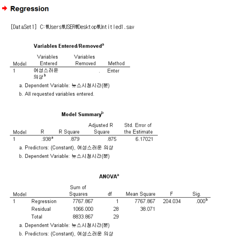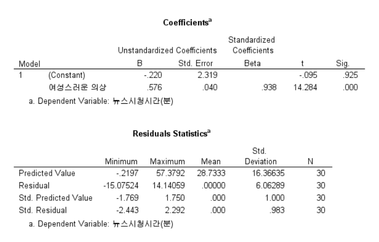 R값은 .938이고 R Square값이 .879입니다. 가설 ‘시청자들이 기상뉴스를 볼 때 기상캐스터가 여성스럽게 옷을 입었다고 느낄 수록 시청률이 더 높게 나타날 것이다.’의 기상캐스터가 여성스럽게 느끼는 것과 시청률은 87.9퍼센트 정도의 상관 관계가 있었습니다.