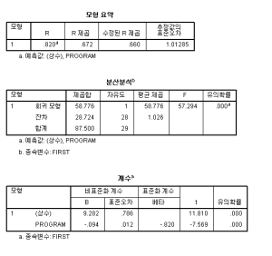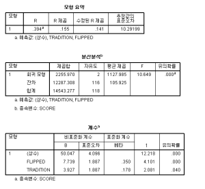 R^2 = 0.155 이므로 플립드 러닝과 전통 교육 방법이 동시에 프로그래밍 성적에 영향을 미치지 않는 다는 것을 알 수 있었다.