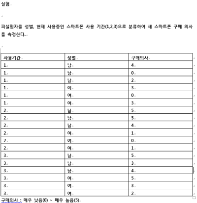 피실험자를 성별, 현재 사용중인 스마트폰 사용 기간(1,2,3)으로 분류하여 새 스마트폰 구매 의사를 측정한다.