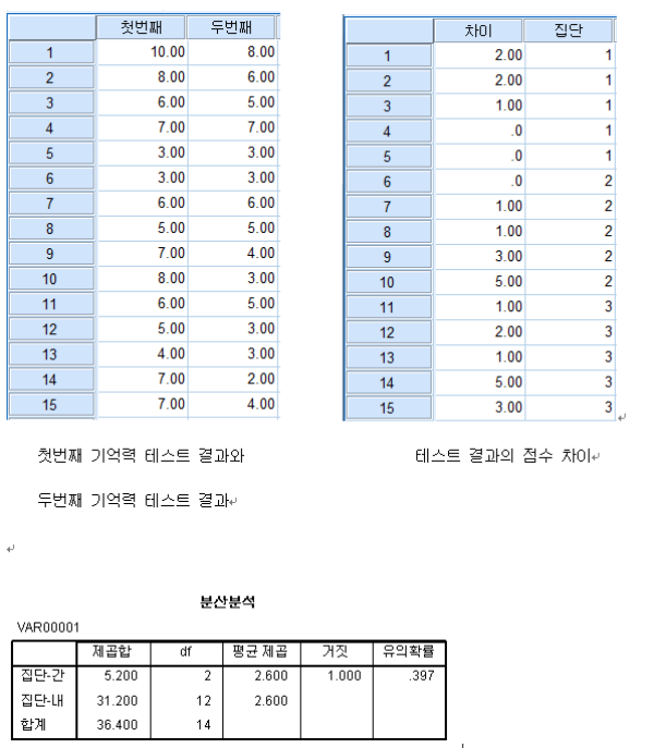 종속변인 : 기억력을 측정하기 위하여, 실험을 통해 테스트를 한다. 모든 피실험자들은 연구자가 제시하는 10개의 숫자를 기억한다. 그리고 10분 뒤 테스트를 통해 몇 개의 숫자를 외우고 있는지를 각각 기록한다. 2시간 후, 각 그룹별로 다시 한번 처음에 제시한 10개의 숫자를 말하게 하여 외우고 있는 수를 다시 기록하게 한다. 이때 각 피실험자별로 처음에 외운 숫자의 개수에서 2시간 후 외우고 있는 숫자의 개수를 뺀 값을 기억력 점수로 기록한다.