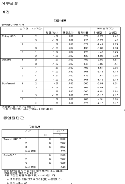 개체-간 효과 검정의 성별 * 기간 항목의 F값이 3.758, 유의확률이 .054로 가설이 성립되지 않는다. 즉 사용중인 스마트폰의 사용 기간과 성별에 따라 새 스마트폰 구매 의사에는 차이가 없다고 생각할 수 있다.(영가설 채택)