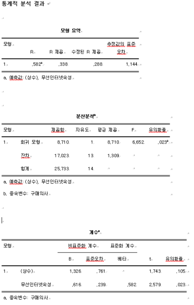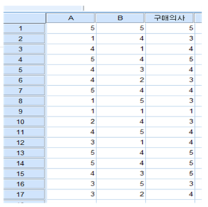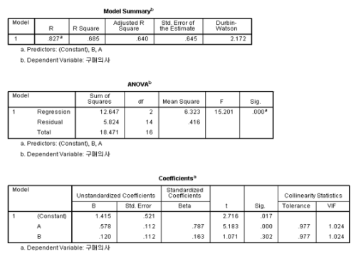 r제곱이 0.685으로 68.5%로 스마트폰 구매의사를 설명해주는데 다중회귀식에 의해서 독립변인 A(디자인), B(스마트폰 어플리케이션) 모두 스마트폰 구매 의사에 영향을 미치고 디자인이 스마트폰 어플리케이션보다 더 영향을 미친다는 것을 알 수 있다.