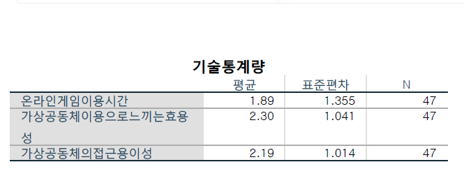 → 독립변인X1 : 가상공동체의 접근의 용이성 → 독립변인X2 : 가상공동체의 소속감에서 오는 효율성 → 종속변인Y : 온라인게임 이용시간