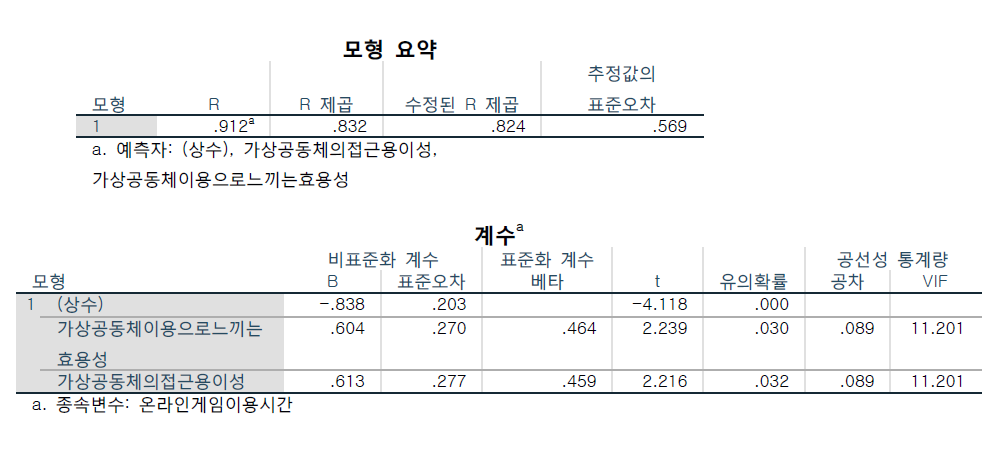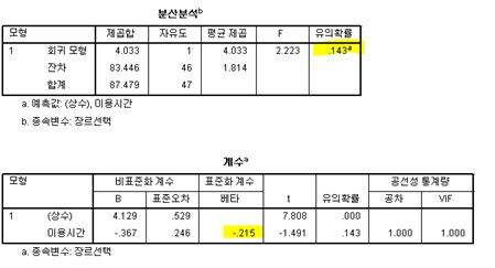 R제곱 값이 0.832로서 종속변수(이용시간)을 83.2% 설명하고 있음을 알 수 있다. F값은 108.623이고 이에 대한 유의확률은 .000이다. 따라서 회귀식의 설명력(R제곱이)이 0이라는 귀무가설을 기각하게 되므로 회귀식이 종속변수를 설명하는 데 유용하다고 할 수 있다. 계수를 살펴보면 위의 다중 회귀식은 다음과 같이 표현된다. Ŷ=-0.838+0.604X1+0.613X2