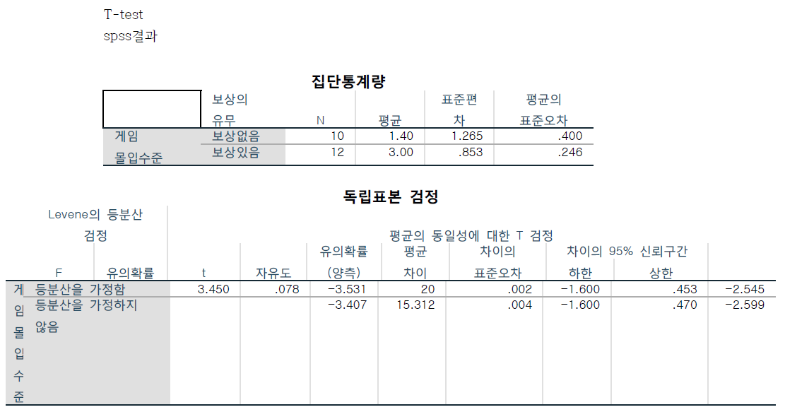→독립변인(IV) : 시기, 집단 시기는 사전과 사후를 나타내며 집단은 통제집단과 실험집단으로 나뉜다. 각 변인은 명목척도로 측정된다. →종속변인(DV) : 사전검사와 사후검사의 차이 사전검사와 사후검사의 차이는 간격 척도로 측정된다. →통제변인(CV) : 게임중독 진단 검사를 통해 걸러진 학생 통제변인은 간격척도로 측정된다.
