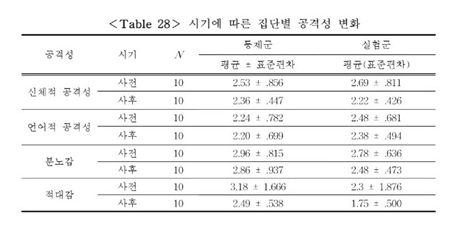 위의 표를 참고하여 시기, 집단에 따른 공격성 분석 결과를 살펴보면 적대감의 경우에는 집단에 따라서는 통계적으로 유의한 차이를 보이지 않았고,(F=4.354), 시기에 따라서는 사전(M=2.74)보다 사후(M=2.12)에서 적대감이 감소하여 시기에 따라 유의한 변화를 보였으나(F=6.834, p<.05), 시기와 집단의 상호작용의 경우에는 통계적으로 유의한 변화를 보이지 않았다.(F=.068). 신체적 공격성, 언어적 공격성, 분노감의 경우에는 집단, 시기, 시기와 집단의 상호작용 모두 통계적으로 유의한 차이를 보이지 않았다.