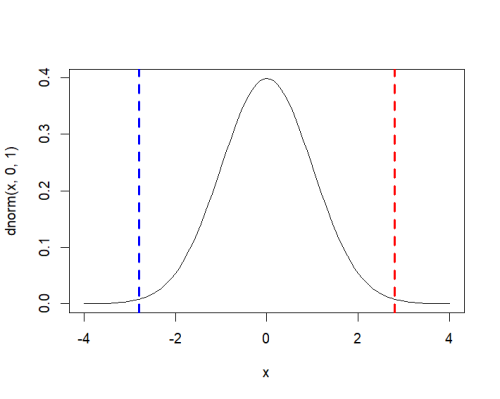 - 즉, z-score 2.8 (혹은 -2.8 이) 나올 확률은 약 5/1000 라는 뜻 (빨간선 윗부분 + 파란선 아랫부분)