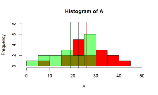 # ANOVA function in R A B tmp.ab <- data.frame(A, B) comb <- stack(tmp.ab) comb colnames(comb)[1] <- "values" colnames(comb)[2] <- "group" comb a.res <- aov(values ~ group, data=comb) a.res.sum <- summary(a.res) a.res.sum # 위에서 F value는 5.444 # 그리고 전체적인 아웃풋을 보면 # Df group 과 Df Residuals # Sum Sq group 과 Residuals # Mean Sq (MS) group 과 MS residuals # MS.group = ms.between # MS.within = ms.within # F value ms.between / ms.within f.calculated # 아래는 기존의 아웃풋에서 확인하는 것 str(a.res.sum) a.res.sum[[1]][1,4] sqrt(a.res.sum[[1]][1,4]) t.result$statistic