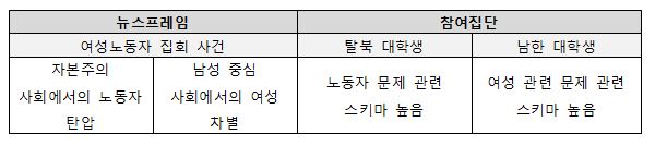 본 연구는 이를 여성노동자 집회 관련 뉴스를 3가지 프레임(여성차별, 노동자탄압, 여성-노동자 혼합)으로 조작한 다음 2개 그룹(남한, 탈북 대학생)에 나타나는 프레이밍 효과를 살펴보았다. 이 연구에서 남한 대학생은 여성문제에, 탈북 대학생은 노동자 문제에 대한 스키마가 더 발달 된 상태이다.