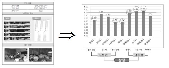 실험방법으로는 15개의 애니메이션 자극물들을 보여주고 실험샘플들을 수집해 감정적 평가척도 9개(화나다, 안타깝다, 슬프다, 우울하다, 나른하다, 설레다, 흥겹다, 행복하다, 쓸쓸하다)를 가지고7점 의미차착도법으로설문지를구성하였다. 이렇게 구성된 설문지를 가지고 2011년 1월23일부터 2주간에 디자인 및 애니메이션 전공에 부합되지 않는 타전공자 20명과 일반인 10명을 대상으로 조사를 실시하였다.