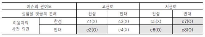 조작된 인터넷 뉴스 기사와 댓글을 제시하기 전에 해당 이슈에 대한 피험자의 기존의견(찬성, 중립, 반대)을 직접 측정했다. 측정된 피험자의 기존의견을 찬성과 반대인 두 집단으로 나누고, 이를 기준으로 본 연구는2 × 2의 요인 설계를 했다. 단, 중립의견을제시한피험자들을분석에서제외했다. 밑의 표에서 보는바와 같이, 실험 설계의 도식은 인터넷 뉴스기사에 달린 댓글의 견해(찬성, 반대) × 이슈에 대한 관여도(고관여, 저관여) 조건하에서피험자의해당이슈에대한기존의견즉, 실험처치 되기 전 의견이 얼마나 변화하느냐를 측정하기 위해 만들어졌다.
