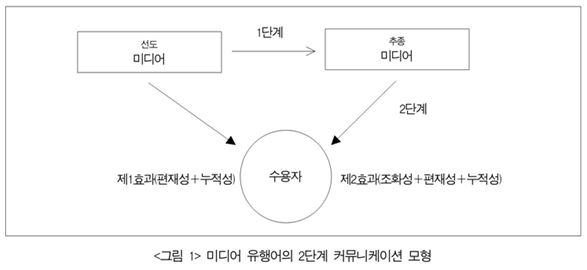 이 모형은 특정 의제에 대해 가치평가적인 의미를 함축한 특정 언론의 미디어 유행어가 1차적으로 수용자에게 직접 영향을 미칠 뿐만 아니라 선도 미디어와 추종 미디어 간의 위계 관계에 의해 다른 미디어를 통해 2차적으로 수용자에게 영향을 미치는 과정을 통해 수용자에게 강력한 영향을 미치는 2단계 커뮤니케이션 흐름을 가정하고 있다. 본 모형은 매스미디어의 메시지가 의견 지도자(opinion leader)에게로 흐른 다음 다시 일반 사람들에게 흘러간다는 카츠와 라자스펠트의 2단계 흐름 모형처럼 미디어 간에도 선도 미디어와 추종 미디어의 위계 관계가 존재할 수 있다는 것을 가정하고 있으며 미디어 유행어와 같은 은유 혹은 비유의 언어적 수사 장치 역시 수용자의 의견 혹은 여론에 특정한 영향을 미칠 수 있다는 것을 가정하고 있다.