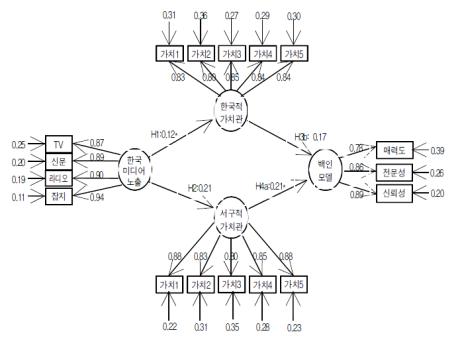 한국 매스 미디어에 대한 노출, 한국적 가치관의 존중 정도와 서구적 가치관의 존중정도가 소비자들의 백인 모델에 대한 매력도, 전문성, 그리고 신뢰도와 어떠한 연계성을 가지고 있는가를 밝혀내기 위하여, LISREL 8을 이용한 구조 방정식모델을 사용하였다. 그로인해 매스미디어에 대한 노출과 한국인 모델에 대한 선호도가 유의미한 결과와 미디어가 대중들의 가치관 형성에 영향을 부분적으로 미친다는 것을 실증적으로 밝혔다. 또한 대중들의 가치관이 광고모델 선호도에 영향을 부분적으로 미친다는 것을 밝혔고 매스미디어가 간접적으로 소비자들의 광고모델 선호도에 부분적으로 영향을 미친다는 것을 알 수 있었다.