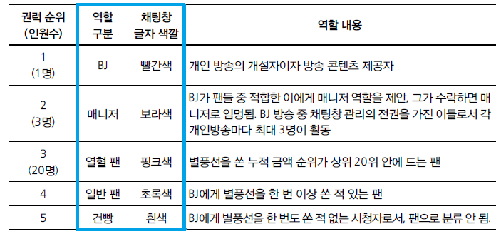먼저, 색과 권력 피라미드에 대해서 논문에서는, 아프리카TV에서는 직위에 따라 채팅창에 입력되는 글자의 색깔이 다른데, 이는 곧, 그 시청자의 신분과 역할을 나타낸다는 것이다. 다시 말해, BJ와 매니저, 그리고 열혈 팬으로 구성된 소수 지배그룹과 나머지 많은 수를 차지하는 일반 팬과 건빵(팬 가입을 하지 않은 시청자)들로 이루어진 피지배 그룹으로 나누어진 피라미드 구조의 권력 체계를 형성한다고 보고 있다.