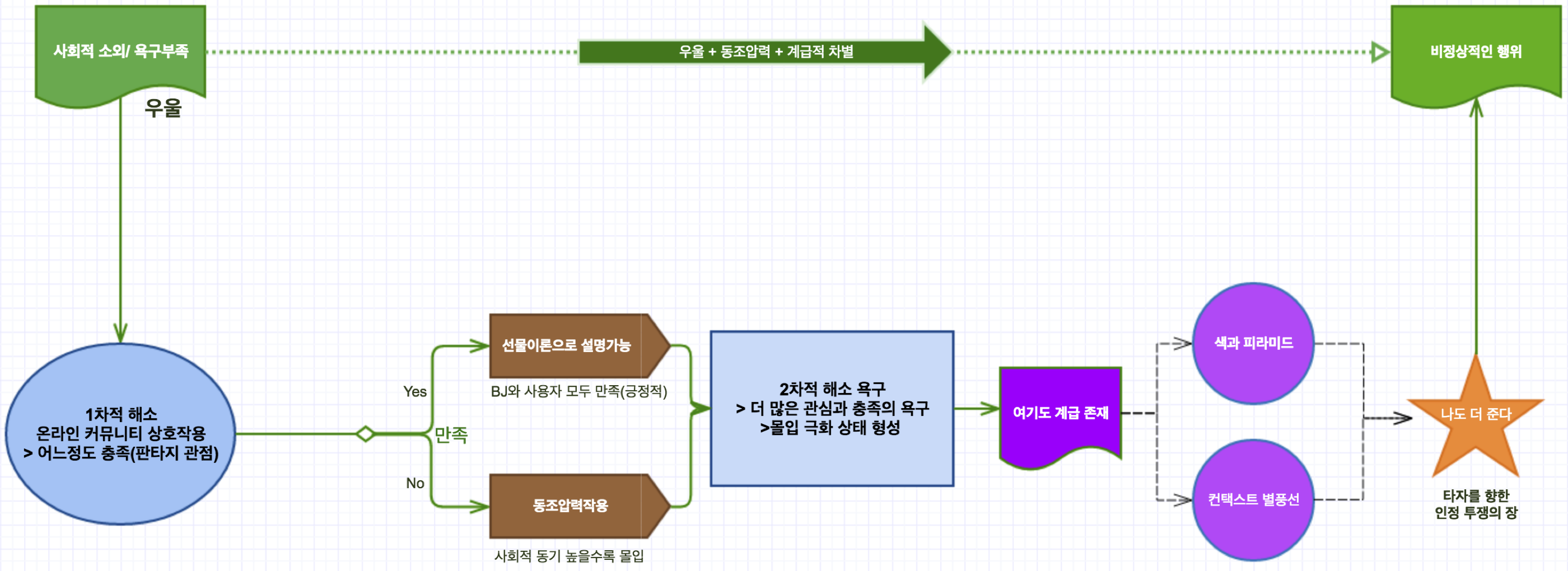 많은 사람들은 사회적으로 소외받거나 욕구부족 상태에 있다. 타인에게 인정받고 싶어 하고, 자신의 욕구를 해소하려 한다. 그래서 아프리카 TV를 통해 사람들은 자신들이 하고 싶고 이루고 싶지만 상황이 여의치 않아 현실적으로 행하기 어려운 것들을 다른 누군가가 하는 모습을 보며 대신 그 욕구를 해소한다. 그리고 우울 이론에 따르면 사람들은 위의 우울함을 일부 해소하지만, 오히려 더욱 중독(2차적 Interaction 단계)에 빠지게 된다. 아프리카TV에 접한 사람들의 1차적 Interaction 단계는 호명(interpellation)과 그에 따른 주체됨의 단계이다. 이는 시청공동체의 판타지적 관점을 통해서 어느 정도 욕구를 충족하고 있다는 것을 알 수 있다. 이 1차적 단계에서 만족을 하게 된다면, 이 단계에서의 별풍선 선물은 단순한 이타적 동기에서의 선물 정도의 수준으로 끝나게 된다. 반면 만족하지 않는다면, 2차적 Interaction 단계로 접어들게 된다. 2차적 단계에서의 개인의 상태는 더욱 자신의 욕구를 충족하거나 우울함을 해소하고 싶어 하며 기본적으로 불안한 상태이다. 그리고 이 단계는 사회적 동조 압력이 쉽게 작용하는 단계이다. 단순히 자기 자신만의 판단이 아닌 동조 압력이 작용해 그 시청자는 사회적 동기에 영향을 받게 되고, 방송 안에서의 흐름과 BJ의 반응 등에 민감하게 반응하여 결국 그러한 흐름 속에서 자신을 돋보이기 위한 방편으로의 행위인 별풍선 선물을 많이 한다. 그러나 아프리카TV상에서의 별풍선 선물은 결국은 현실사회의 돈에 따른 권력구조와 비슷한 사회에 접어들게 된다.(색과 권력 피라미드) 그래서 시청자는 더욱 그 공동체에서 다른 구성원들과 BJ에게 인정과 지지를 얻기 위해 별풍선을 쏘고, 결국 이는 그러한 여러 시청자들 간의 인정투쟁의 장이 된다.(타자를 향한 인정투쟁의 장) 따라서 이로 인해 별풍선 쏘기 경쟁 현상이 빈번하게 일어나게 되고, 결국 많은 양의 별풍선을 BJ에게 선물하는 결과를 낳게 된다. 결론적으로 우리는 사람들이 왜 별풍선을 BJ에게 상식적으로 이해할 수 없을 만큼 많이 선물하는지를 이와 같이 살펴 볼 수 있다.