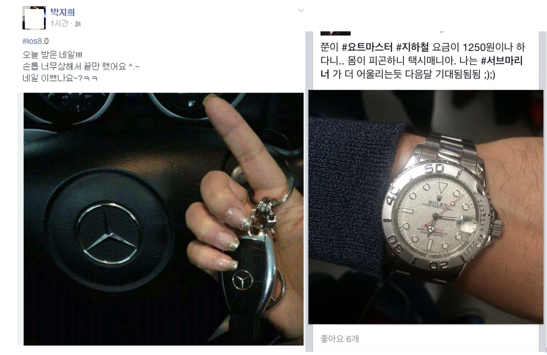 SNS에서 또한 우리는 ‘인정투쟁’을 찾아볼 수 있다. 그림 4은 일명 ‘허세 샷’이라고 불린다. 자랑 아닌 척 하는 자랑을 하는 행동이라고 볼 수 있다. 재력이나 인맥, 경험 등을 우회적으로 과시하는 허세 샷이 요즘 SNS에서는 대세이다. 이러한 현상으로 인해 SNS허언증 또한 큰 이슈가 되고 있다. 이러한 현상은 일반인은 물론이고 연예인도 보여주고 있다. 후에 자신의 이러한 행동을 부끄러워하며 반성하는 점도 쉽게 찾아 볼 수 있다. 국내 뿐만 아니라 해외에서도 예를 들 수 있는데, 호주의 에세나 오닐은 호주 SNS 스타로 불릴만큼 SNS에서의 대스타로 불렸었다. 하지만 갑자기 그녀는 SNS을 중단한 후 그 동안 SNS에서 보여진 자신의 모습이 모두 가짜였음을 고백했다. 그녀가 착용했었던 값비싼 의상과 장신구는 협찬이라고 설명했다.