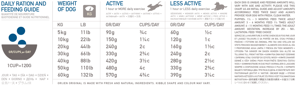 Dog Weight Less Active Active 1-2lb (0.5-1kg) 1/8 – 1/4 cup (14 – 29g) 1/8 – 1/4 cup (14 – 29g) 2-5lb (1-2.3kg) 1/4 – 1/3 cup (29 – 32g) 1/4 – 3/8 cup (29 – 48g) 5-10lb (2.3-4.5kg) 1/3 – 3/4 cup (32 – 86g) 3/8 – 1 cup (48 – 115g) 10-15lb ( 4.5-6.8kg) 3/4 – 1 1/4 cups (86 – 143g) 1 – 1 3/8 cups (115 – 162g) 15-20lb (6.8-9kg) 1 1/4 – 1 2/3 cups (143 – 191g) 1 3/8 – 1 3/4 cups (162 – 201g) 20-25lb (9-11.3kg) 1 2/3 – 2 cups (191 – 229g) 1 3/4 – 2 1/4 cups (201 – 261g)