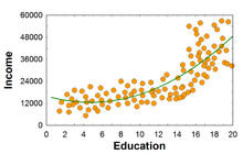 | Correlation matrix for income, amount of education, age, and IQ | |||