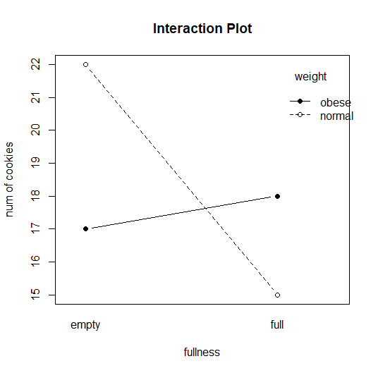 Fit: aov(formula = ncookies ~ weight * fullness, data = cookies)
