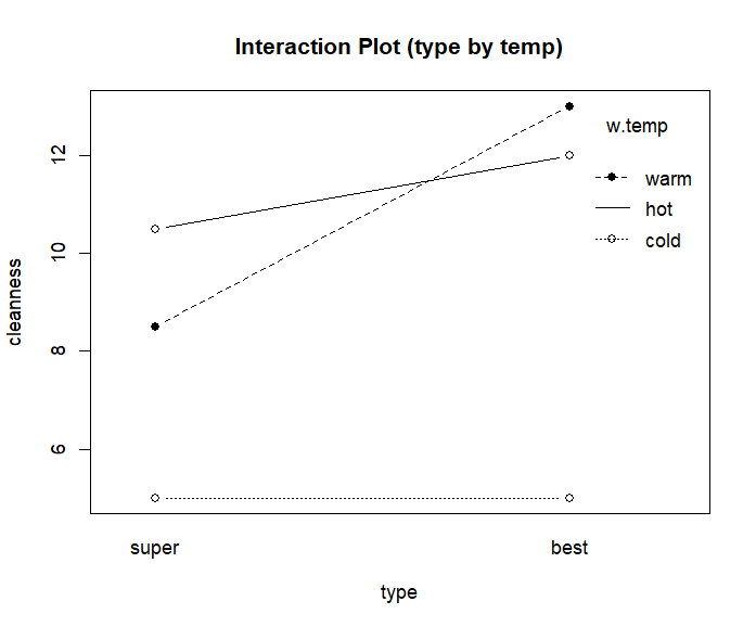 그러나, 사실 위의 표의 해석이 그리 직관적이지는 않다. 상호의존적이라는 단어가 의미하는 것이 그리 직관적이지 않기 때문이다. 이럴 경우, 흔히 연구자는 위의 표를 아래와 같은 도표로 바꾸어 살펴보게 되는데, 이렇게 하는 이유는 상호효과(InteractionEffect)의 존재여부가 완연히 들어나기 때문이다.