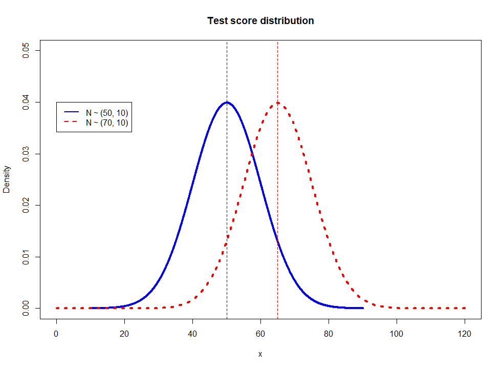 우선 연구자가 조사방법론 수업을 듣는 전체 모집단 학생들의 평균(이런 종류의 테스트가 있다고 가정)이 얼마인지를 알고 있다는 가정을 하자 (평균 = 50, stdev = 10).
