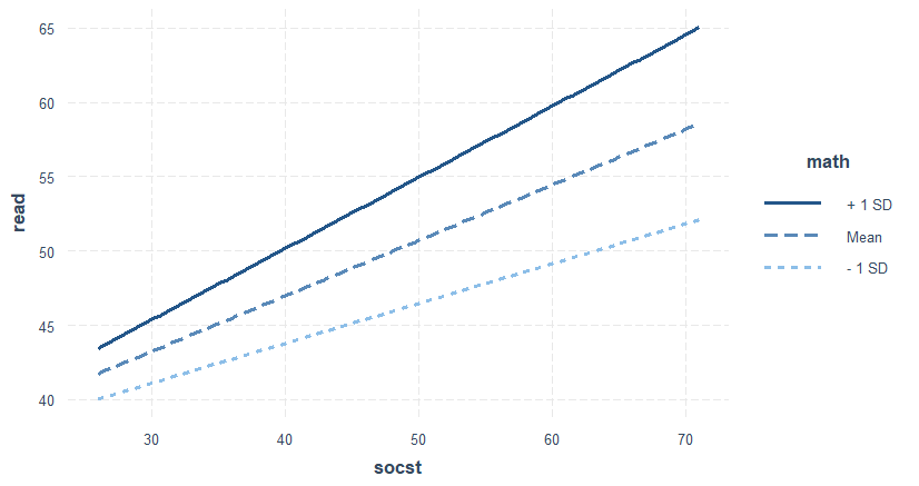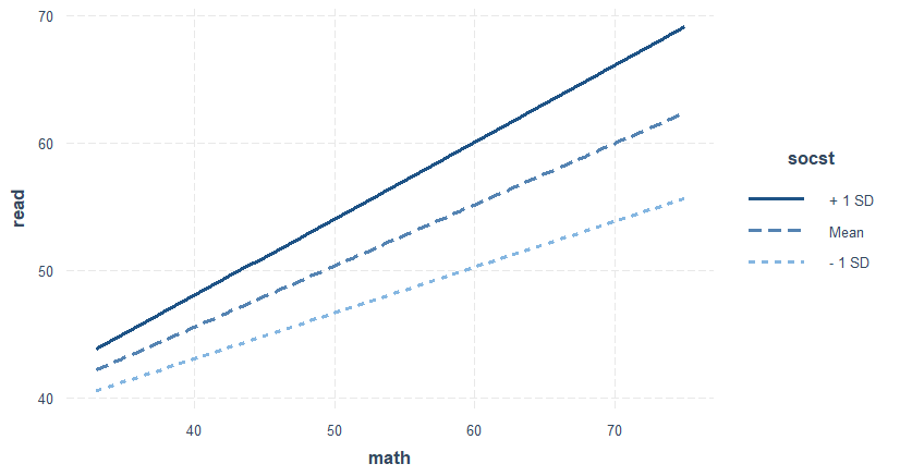 Main effects 의 significance level이 (p-value < .05) 사라지고 interaction effect가 significant하게 되었다는 것은 math의 read에 대한 설명력이 socst의 양에 따라서 달라지게 된다는 것을, 그리고 동시에 socst의 설명력이 math의 변화에 따라서 달라지게 된다는 것을 말하는 것으로 이를 종합적으로 고려하면 두 메인 독립변인의 효과는 존재한다고 설명하는 것이 (m3에 따라서) 합리적이다. 아래는 이를 도식화한 그래프이다. 첫 번째 그래프를 보면