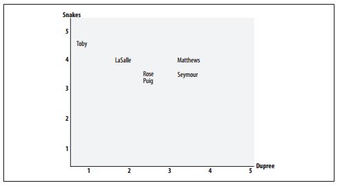 >>> import recommendations imp.reload(recommendations) >>> recommendations.sim_distance(recommendations.critics,'Lisa Rose','Gene Seymour') 0.148148148148