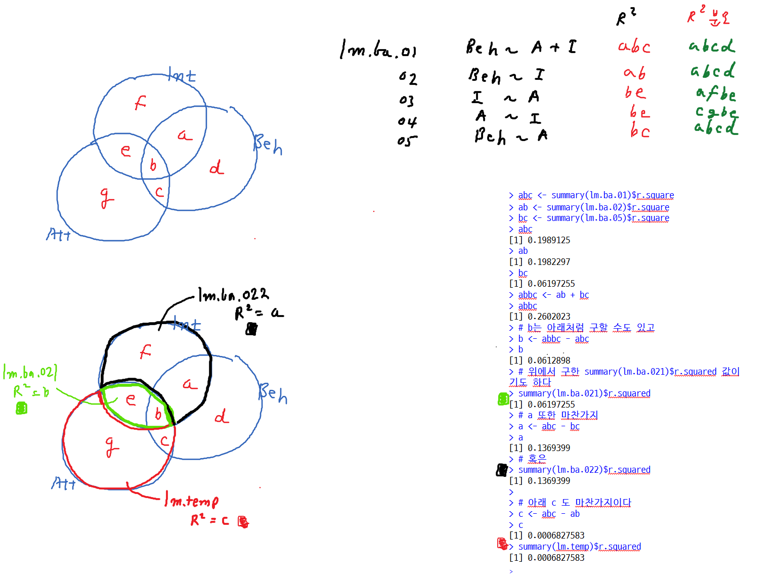 - 우선 attitudes와 (x 변인) behavior (y 변인) 간의 significant한 관계가 있다. 즉, lm(behavior ~ attitudes) 의 f statistics 값이 significant하다. 이 coefficient값을 c 라고 하자.