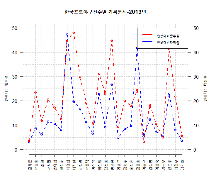 main="한국프로야구선수별 기록분석-2013년",lwd=2)