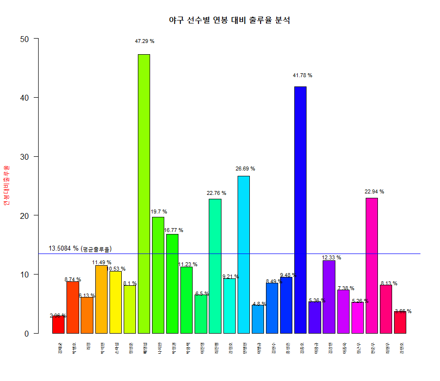 text(x=aver-11, y=14.5, col="black", cex=0.8, labels=paste(aver,'%',"(평균출루율)"))