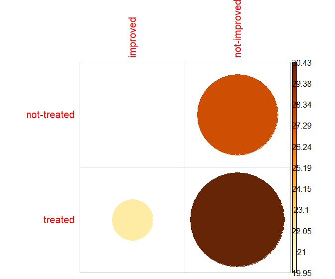 > chisq <- chisq.test(df$treatment, df$improvement, correct=F)