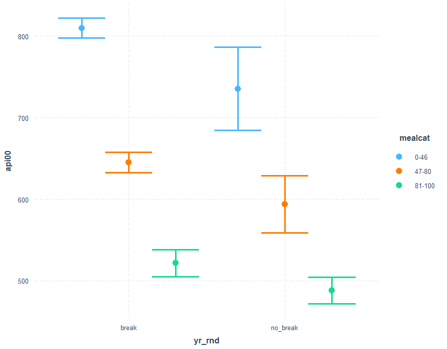 cat_plot(mod4, pred=yr_rnd, modx=mealcat) cat_plot(mod4, pred=yr_rnd, modx=mealcat, plot.points = TRUE)