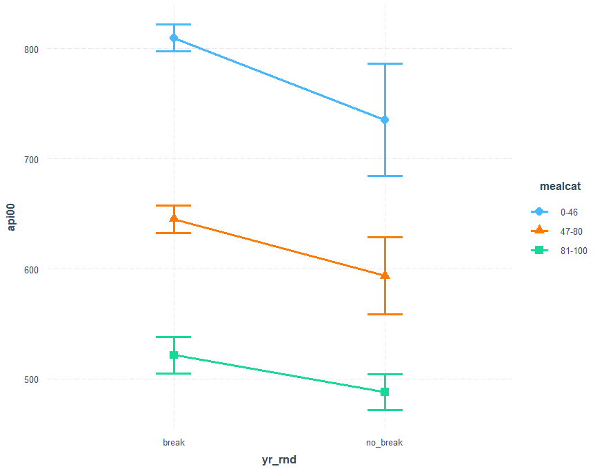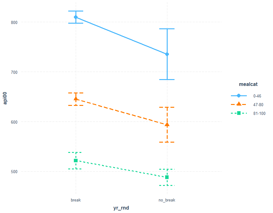 cat_plot(mod4, pred=yr_rnd, modx=mealcat, geom = line) cat_plot(mod4, pred=yr_rnd, modx=mealcat, geom = "line", point.shape = TRUE) cat_plot(mod4, pred=yr_rnd, modx=mealcat, geom = "line", point.shape = TRUE, vary.lty = TRUE)